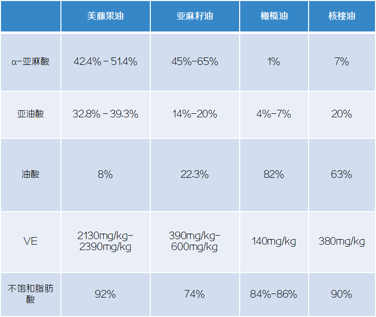 美藤果油相對于其他植物油的優勢:美藤果油不飽和脂肪酸高達92%,其中人體必需脂肪酸α-亞麻酸和亞油酸含量高于其他油脂,活性物質生育酚(VE)含量遠大于亞麻籽油。