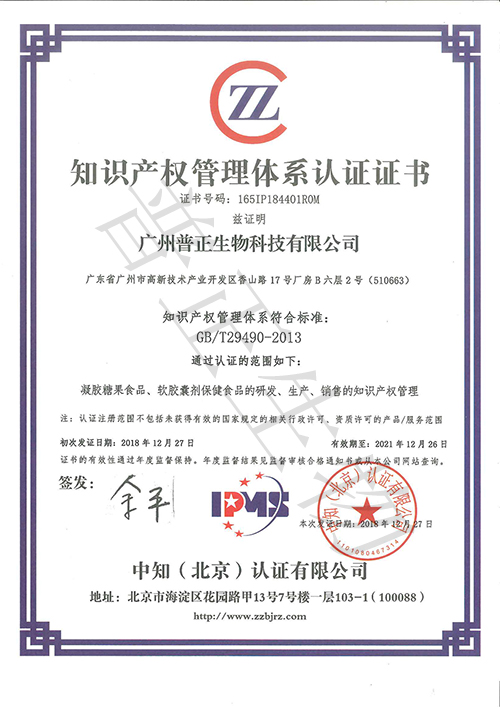 普正生物于2018年12月27日通過了知識產權管理體系認證,獲得由中知(北京)認證有限公司頒發的《知識產權管理體系認證證書》。